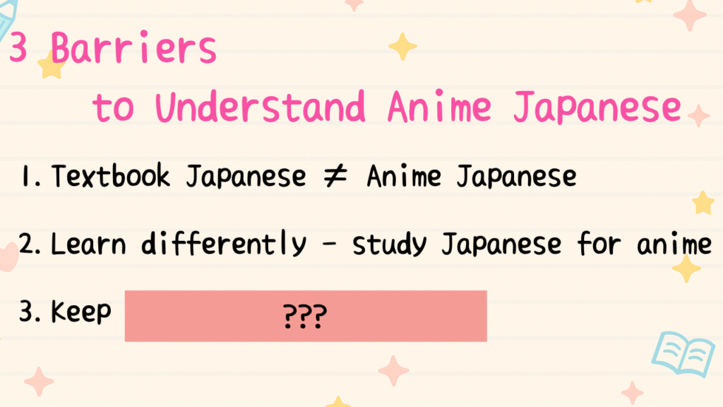 In Day 2, we talked about the difference between textbook Japanese and anime Japanese — one of the three barriers you must overcome to understand anime without subtitles.